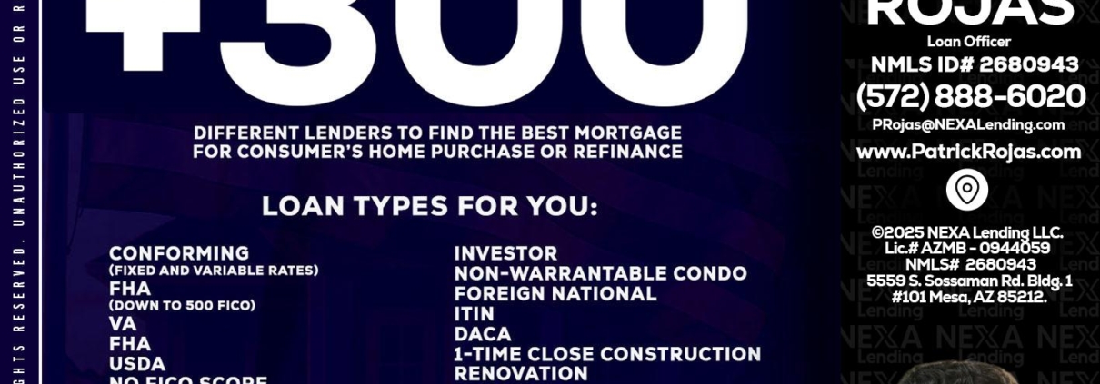 Hi, my name is Patrick Rojas. I’m a Loan Officer with NEXA Lending LLC., offering personalized mortgage solutions, fast customized quotes, great rates and service with integrity.