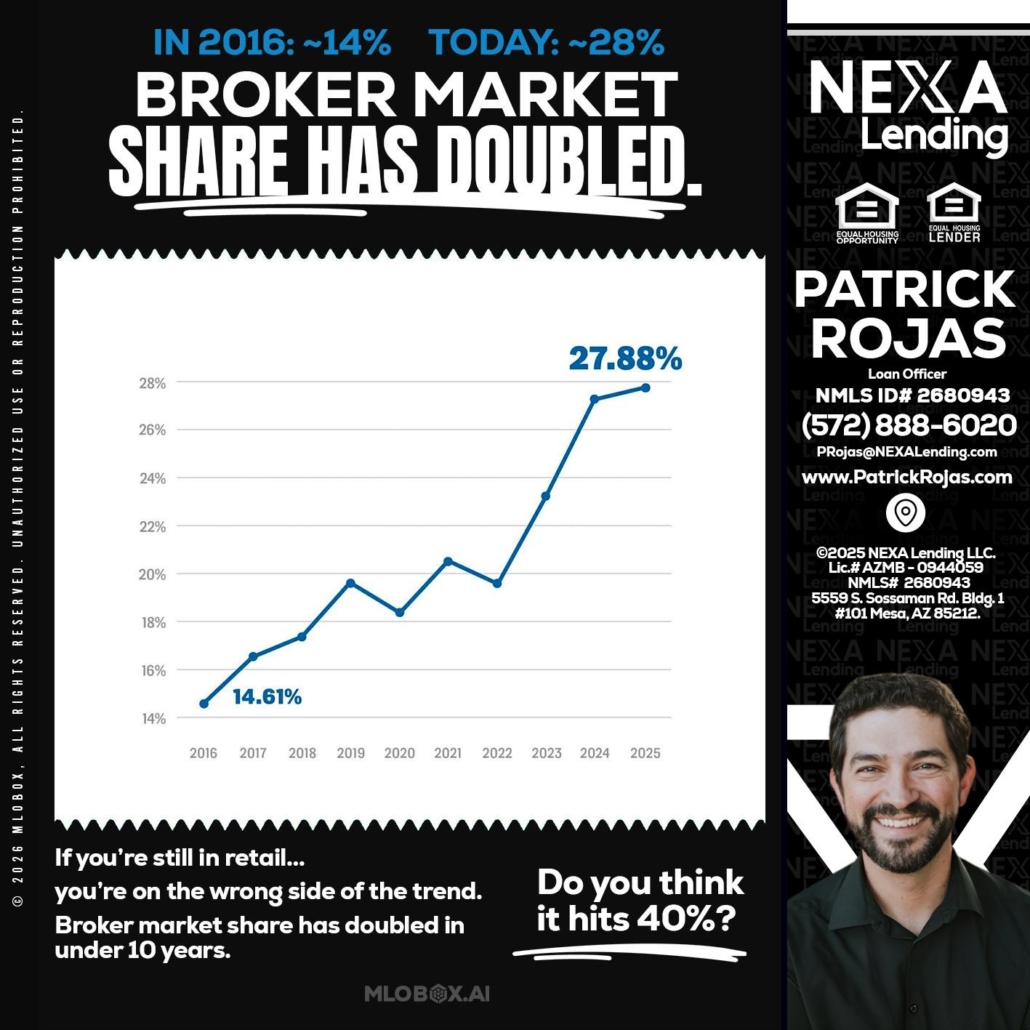 BROKER MARKET - Patrick Rojas -Loan OfficerHi, my name is Patrick Rojas. I’m a Loan Officer with NEXA Lending LLC., offering personalized mortgage solutions, fast customized quotes, great rates and service with integrity.