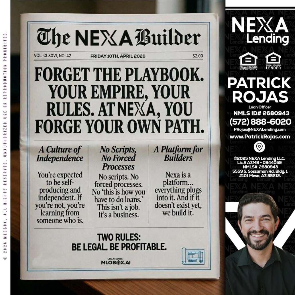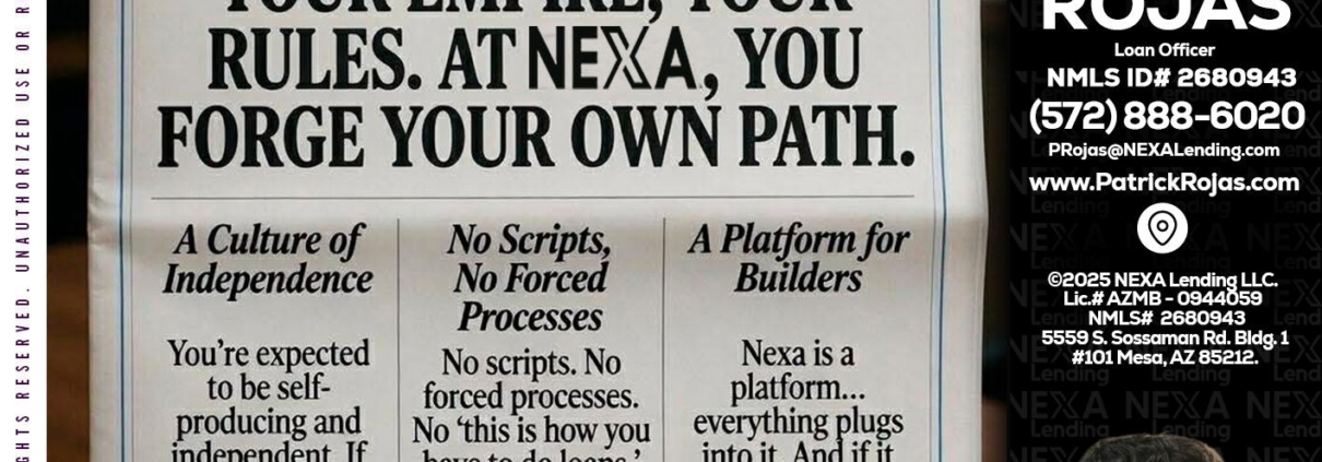 Hi, my name is Patrick Rojas. I’m a Loan Officer with NEXA Lending LLC., offering personalized mortgage solutions, fast customized quotes, great rates and service with integrity.