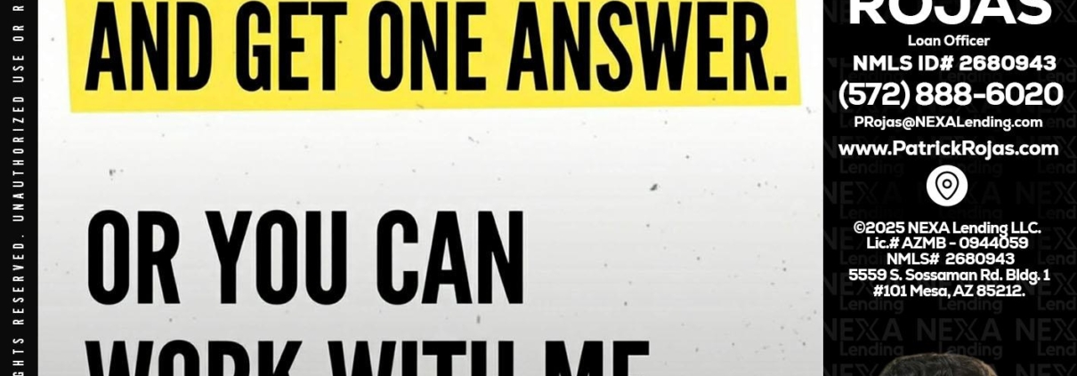 YOU CAN GO TO - Patrick Rojas -Loan OfficerHi, my name is Patrick Rojas. I’m a Loan Officer with NEXA Lending LLC., offering personalized mortgage solutions, fast customized quotes, great rates and service with integrity.